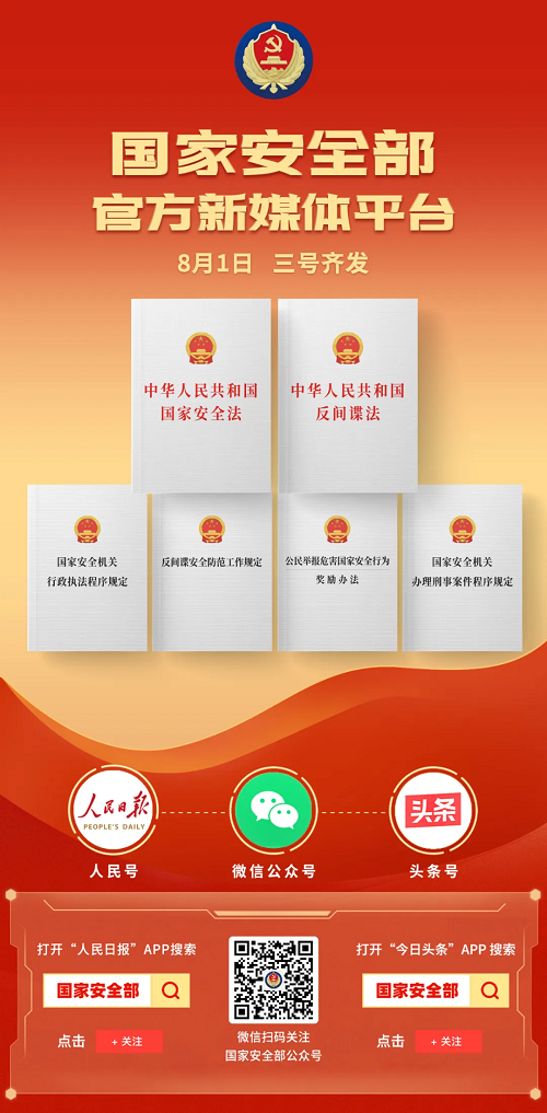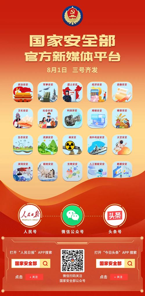 今天,國(guó)家安全部頭條號(hào)、人民號(hào)正式上線了。這是國(guó)家安全機(jī)關(guān)新的官方權(quán)威宣傳陣地,與國(guó)家安全部官微共同打造國(guó)家安全部官方新媒體平臺(tái)。歡迎大家關(guān)注國(guó)家安全部官方微信公眾號(hào)、國(guó)家安全部頭條號(hào)、國(guó)家安全部人民號(hào),感受隱蔽戰(zhàn)線的“神秘”工作、“神奇”事業(yè)、神圣使命!