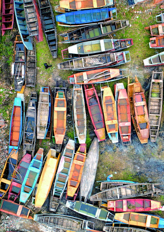 ▲湖北省宜都市枝城鎮(zhèn)白水港村一處“上岸”的漁船堆放點(無人機照片),這些收回的漁船將被集中拆解(2020年1月2日攝)。