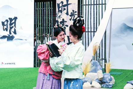 近日,山西傳媒學院在太原市萬柏林區(qū)萬象城下沉廣場舉辦了“漢服印象”傳統(tǒng)服飾教學成果展演?;顒蝇F(xiàn)場,35名來自該校的大二學生,均身著漢、唐、宋、明等朝代的服飾,向現(xiàn)場的觀眾展示了60套獨具特色的原創(chuàng)設計作品,并進行了沉浸式國風走秀教學成果展演和氣氛熱烈的古詩詞問答互動節(jié)目。
