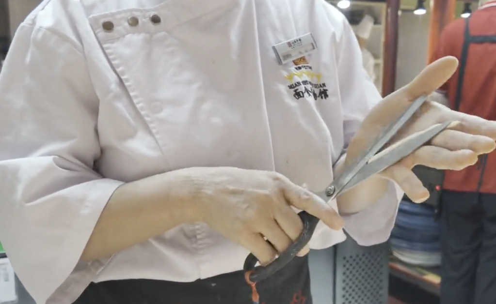 圖為夾心面。新華社記者 王怡靜 攝??關于剪刀面的故事很動人——“‘剪子面,兩頭尖,吃到肚里胃不酸’。相傳剪刀面是以前喬家大院的喬貴發(fā)走西口的時候,留在家里的妻子為丈夫裁剪衣服,由于過于思念丈夫,一走神就把剪刀也帶到了廚房里,于是便有了剪子面?!覆凰帷鋵嵰彩恰牟凰帷??!崩铉f。剪刀面一般用來做湯面,配蔬菜吃,也有著希望家人安康的寄托。