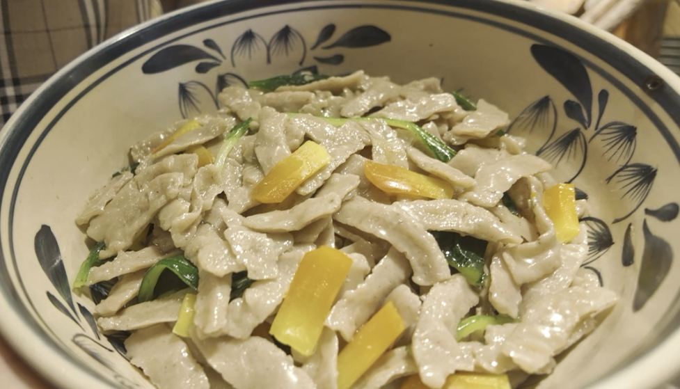 當(dāng)然,最好用的工具當(dāng)屬做面的“魔法棒”——手指。用手指將莜面的小面團搓成橄欖形,上鍋一蒸,就成了“莜面魚魚”;將面團放在砧板上,用手掌后部往前推壓成薄片,就成了“栲栳栳”;將面團分切成小面丁以后,用大拇指一抿,就成了“貓耳朵”;將小麥面加一兩種雜糧面混勻后和成較軟的面團,勻速將面擠壓出手指縫,就成了“握流流”。在“魔法棒”的作用下,面團變成了各式各樣的美餐,給山西人帶來了無盡舌尖上的享受。