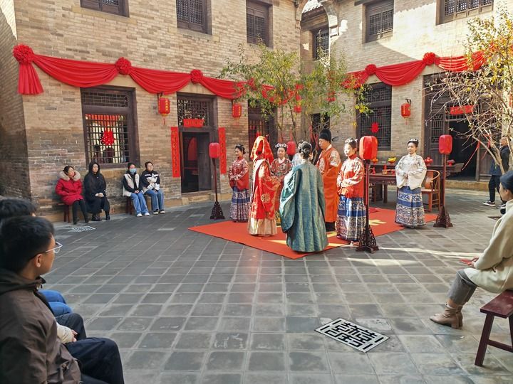 隨著演員齊聲吟誦,古院落中,一場明制出閣禮正在上演。不大的小院擠滿了觀禮游客,院外不少人沒擠進(jìn)來,還在踮腳朝里望。這里是山西省高平市河西鎮(zhèn)的喜鎮(zhèn)蘇莊景區(qū)。