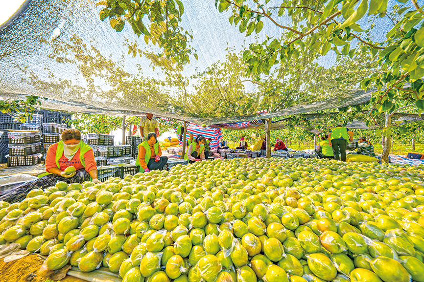 連綿的秋雨打在塑料篷布上,發(fā)出“噼噼啪啪”的聲響。在果園一處臨時搭建的避雨棚下,剛采摘的富士蘋果被堆成了“小山”,史蘭計(jì)和幾個鄉(xiāng)親正忙著給它們套網(wǎng)套。“等雨停了,收購商就要來拉走?!彼f。