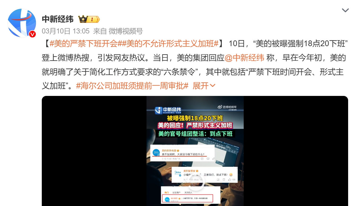 美的回應媒體時表示,今年以來,美的明確了關于簡化工作方式要求的“六條禁令”,其中就包括“嚴禁下班時間開會、形式主義加班”。