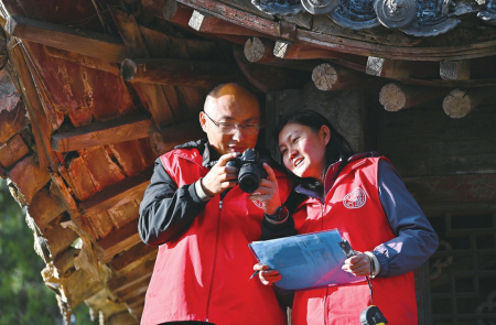 4月10日,張東星(左)、王燕燕在對山門木基層修繕痕跡拍照后進(jìn)行現(xiàn)場分析。