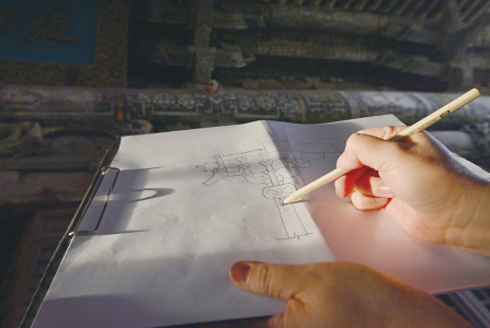 4月9日,趙利芳現(xiàn)場繪制正殿前檐柱頭鋪?zhàn)鳌?/span>