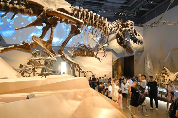 8月21日,浙江湖州,游客在恐龍館內(nèi)參觀。暑假進(jìn)入尾聲,位于湖州市安吉縣的浙江自然博物院熱度不減。視覺(jué)中國(guó)供圖