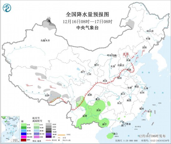 全國(guó)降水量預(yù)報(bào)圖(12月16日08時(shí)-17日08時(shí))