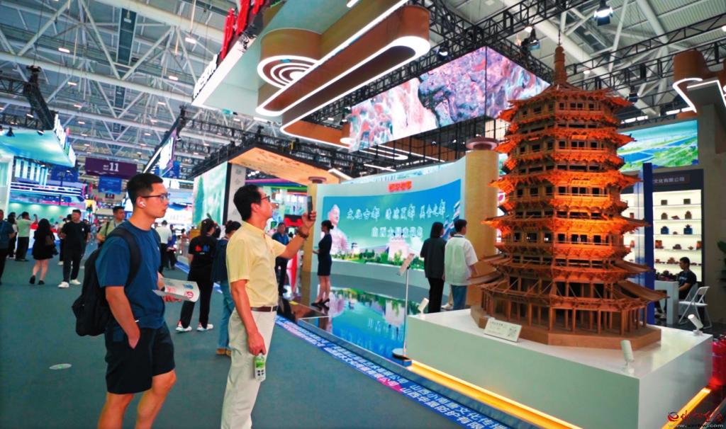 山西晟龍木雕模型藝術有限公司制作的應縣木塔模型一亮相,便吸引了眾多觀展游客的目光。精美絕倫的造型引得人們嘖嘖稱奇,紛紛拿出手機拍照記錄分享。該模型高約3米,最大直徑1.9米,通過20∶1的比例微縮打造,復刻了應縣木塔的榫卯結(jié)構(gòu),其內(nèi)部樓梯扶手清晰可見,門窗都能打開?!拔覀兊倪@件展品,是由二十多個師傅經(jīng)過半年多的時間完成的。這次為了來深圳參展,我們專門把它從定襄裝運發(fā)車,用了整整兩天半的時間才送到,跨越了將近兩千公里?!痹摴究偨?jīng)理張艷峰告訴記者。