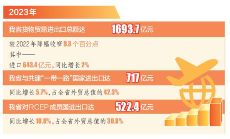 本報(bào)訊(記者孟婷)2月14日,記者從太原海關(guān)獲悉,據(jù)統(tǒng)計(jì),2023年我省貨物貿(mào)易進(jìn)出口總額達(dá)1693.7億元,較2022年降幅收窄9.3個(gè)百分點(diǎn)。其中,進(jìn)口643.4億元,同比增長(zhǎng)2%。同期,我省與共建“一帶一路”國(guó)家進(jìn)出口達(dá)717億元,同比增長(zhǎng)5.7%,占全省外貿(mào)總值的42.3%。我省對(duì)RCEP成員國(guó)進(jìn)出口達(dá)522.4億元,同比增長(zhǎng)10.8%,占全省外貿(mào)總值的30.8%。
