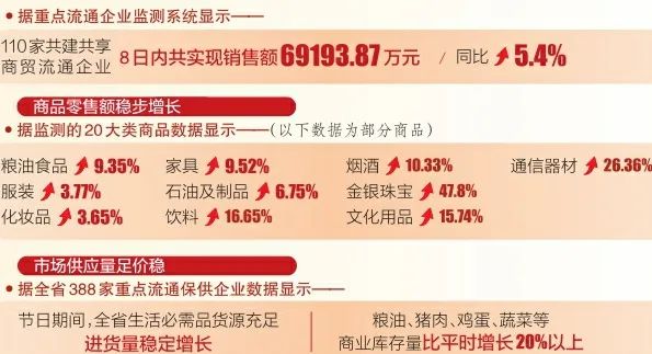 省商務廳相關(guān)負責人介紹,總體來看,全省各級商務主管部門認真落實生活必需品、重點零售和餐飲企業(yè)日報制度和生活必需品市場異常情況“零報告”制度,從市場供應、擴大消費等方面入手,完善應急措施,壓實工作責任,多措并舉確保了節(jié)日市場繁榮穩(wěn)定。