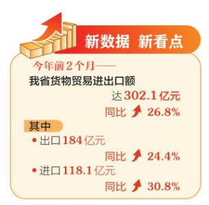 本報訊(記者孟婷)3月13日,太原海關發(fā)布最新統(tǒng)計數(shù)據(jù),今年前2個月,我省貨物貿易進出口額達302.1億元,同比增長26.8%。其中,出口184億元,同比增長24.4%;進口118.1億元,同比增長30.8%。