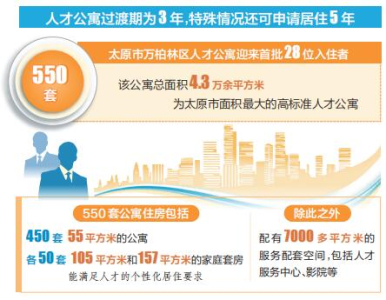 太原市高度重視人才工作,大力實施人才強市戰(zhàn)略,不斷創(chuàng)新人才政策,優(yōu)化人才生態(tài),為各類人才提供廣闊的發(fā)展舞臺。作為太原市的核心城區(qū),萬柏林區(qū)搶抓打造人才高地的重大機遇,精心建設(shè)拎包入住、設(shè)施齊全、服務(wù)優(yōu)質(zhì)的高品質(zhì)人才公寓。550套公寓住房包括450套55平方米的公寓、105平方米和157平方米的家庭套房各50套,能滿足人才的個性化居住要求。除此之外,還配有7000多平方米的服務(wù)配套空間,包括人才服務(wù)中心、影院、餐廳、書吧、健身房、創(chuàng)客空間等。
