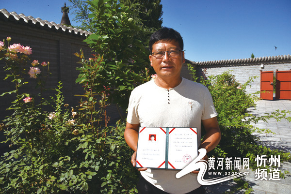 魏文福手捧省級(jí)谷子產(chǎn)業(yè)高級(jí)技能職業(yè)農(nóng)民資格證