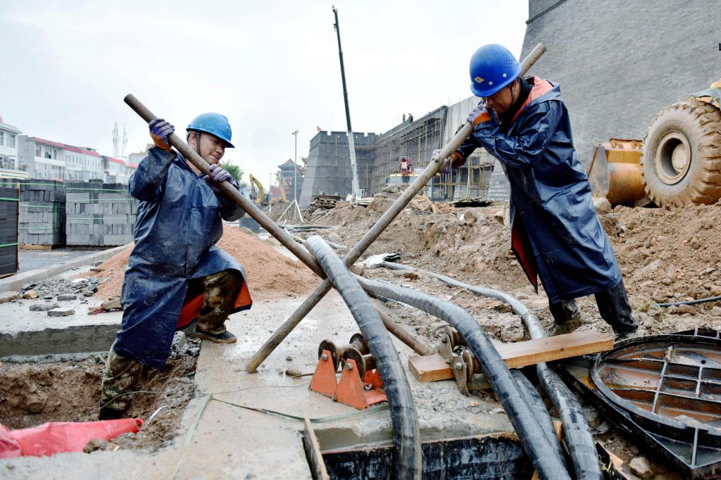 國網(wǎng)忻州供電公司員工在秀容古城電力配套建設(shè)現(xiàn)場敷設(shè)電纜