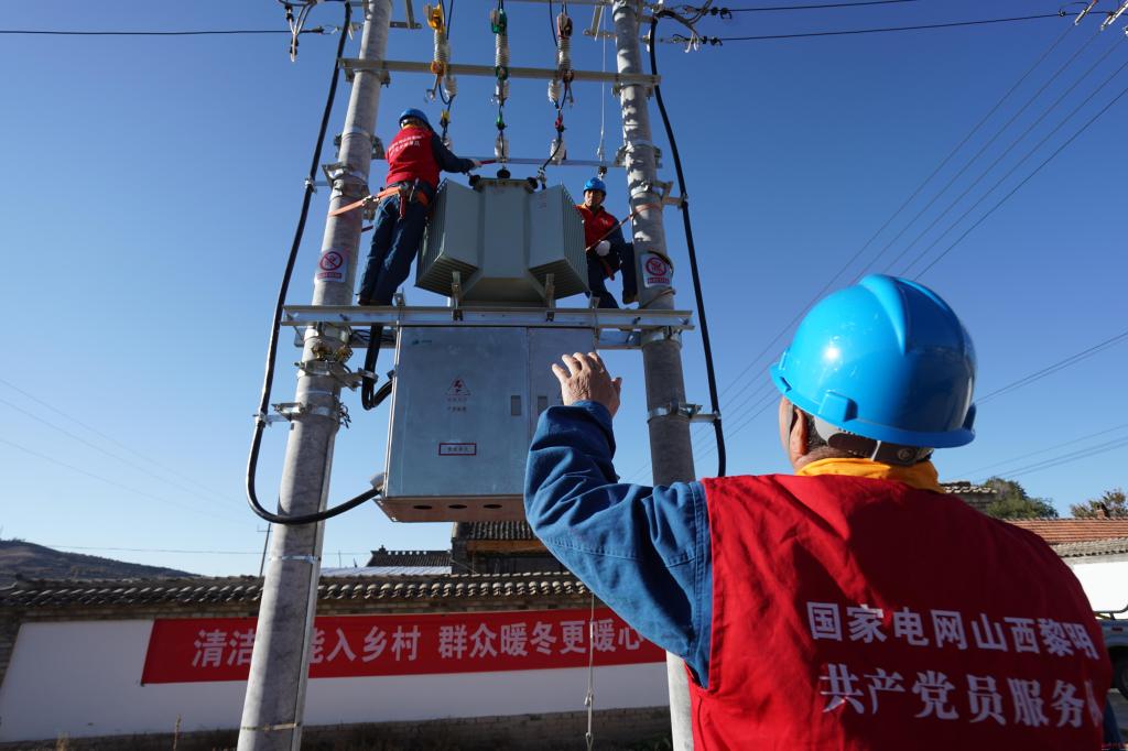 山西-電網(wǎng)建設(shè)-2020年10月3日,國網(wǎng)岢嵐縣供電公司員工在團(tuán)城子村“煤改電”現(xiàn)場緊固高壓引線設(shè)備線夾(邊武攝)