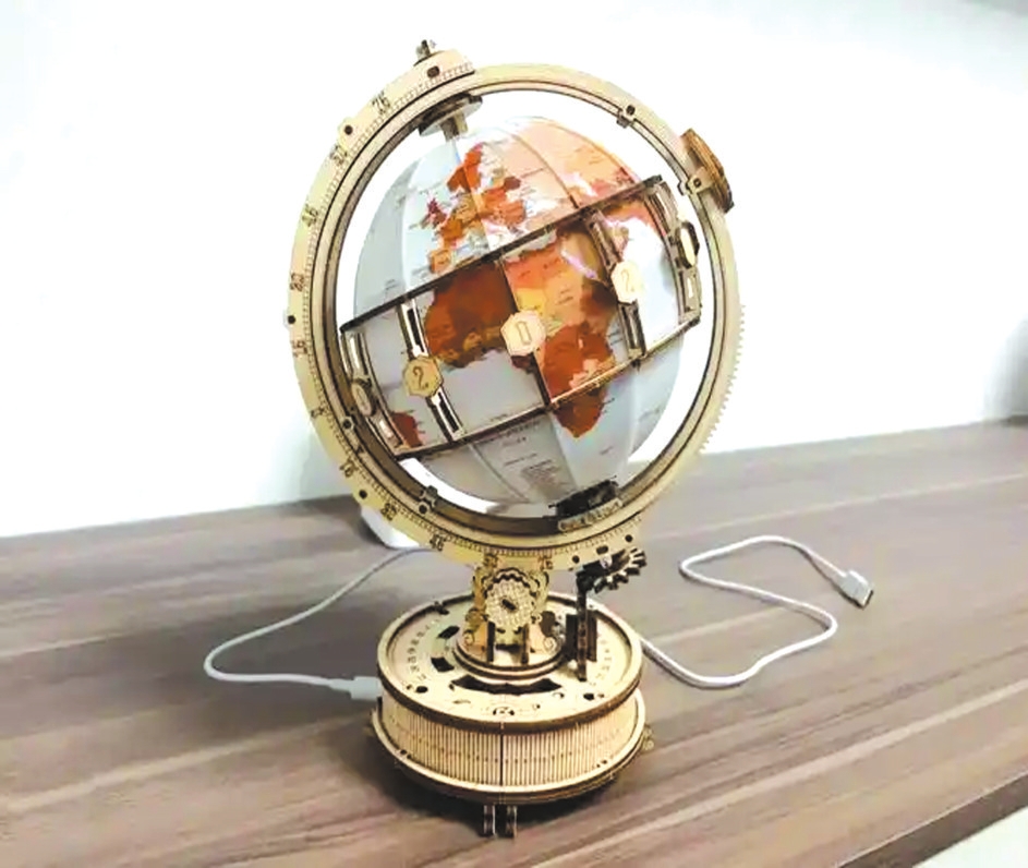 “沒用一顆釘子、一滴膠水,我們利用了榫卯技藝,讓108塊形狀各異的木構(gòu)件緊密連接,構(gòu)成一個鏤空的地球,祈盼世界團結(jié)、人類和平?!薄堕久挠钪妗肪巹?、忻州王爾文玩(魯班鎖、孔明鎖)(以下簡稱“王爾文玩”)傳統(tǒng)木作技藝非物質(zhì)文化遺產(chǎn)代表性傳承人趙永功說。