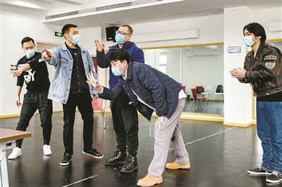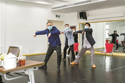 雖然疫情正在向好,但防控的弦還不能就此放松下來。整個(gè)藝苑大樓彌漫著消毒水的味道,演員們都戴著口罩,分散在排練廳、會(huì)議室、演員隊(duì)等各個(gè)角落進(jìn)行排練。