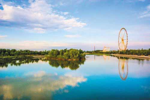 沿著河岸邊的石板路緩緩向西前行,手中撫過岸邊的花崗石欄桿,偶有微風(fēng)拂面,帶起耳畔凌亂的發(fā)絲,讓人頓覺神清氣爽,想要沉醉在眼前的迷人風(fēng)光中。這時,不遠(yuǎn)處忽然傳來人們的歡呼聲和尖叫聲,我上前一看,原來已經(jīng)走到了云中河游樂園。游樂園里的娛樂項目多樣,其中最醒目的便是那高達(dá)88米、修建時高度居山西第一的摩天輪,伴隨著悅耳的歌謠,摩天輪緩緩地轉(zhuǎn)動著,帶著人們對浪漫的遐想。