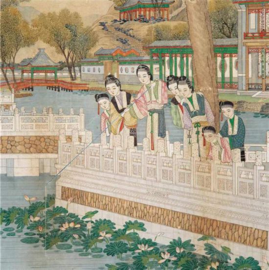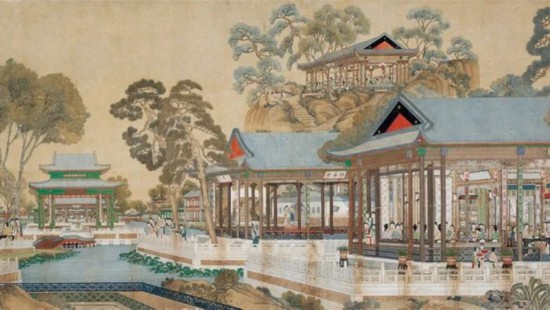 畫面中,曲折縈紆的溪水自蘅蕪院流經(jīng)牡丹亭、凹晶館、蓼風軒、秋爽齋等地,最終蜿蜒向畫面遠方,層層亭臺廊橋,一望無盡。許軍杰認為,此繪之溪水應為沁芳溪。正如周汝昌先生在《北京大觀園·引言》中評價:“大觀園全部的主脈與‘靈魂’是一條蜿若游龍的‘沁芳溪’。亭、橋、泉、閘,皆以此二字為名,可為明證。一切景觀,依溪為境”,“大觀園的一切池、臺、館、泉、石、林、塘,皆以沁芳溪為大脈絡而盤旋布置。”圖中的這曲溪水亦有異曲同工之功能,將兩岸建筑、山石、樹木巧妙地聯(lián)系在一起,使其形成一個有機的園林整體。(李君娜)