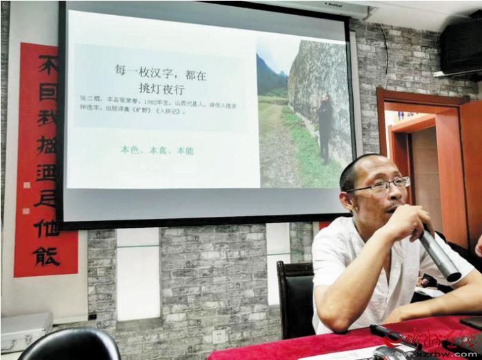 本報(bào)訊 8月15日晚,位于忻州市七一北路的好目匠眼鏡店迎來一場文學(xué)盛會。保德縣、岢嵐縣、五寨縣、原平市、定襄縣的詩歌愛好者,與忻州城區(qū)的詩歌愛好者一起聆聽了著名詩人張二棍關(guān)于詩歌創(chuàng)作的講座,甚至有詩歌愛好者專門從北京趕回忻州。當(dāng)晚,連講座廳外都站滿了聆聽的人。