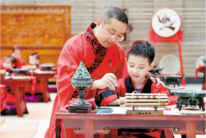 9月13日,一場(chǎng)漢服“開筆禮”在西安大唐西市博物館舉行,多名孩童著漢服,行漢禮,通過(guò)“朱砂開智”“啟蒙描紅”等環(huán)節(jié)體驗(yàn)中國(guó)傳統(tǒng)文化。圖為家長(zhǎng)帶領(lǐng)孩子一起進(jìn)行“啟蒙描紅”。 新華社記者 劉瀟 攝 (責(zé)任編輯:盧相?。?/span> |