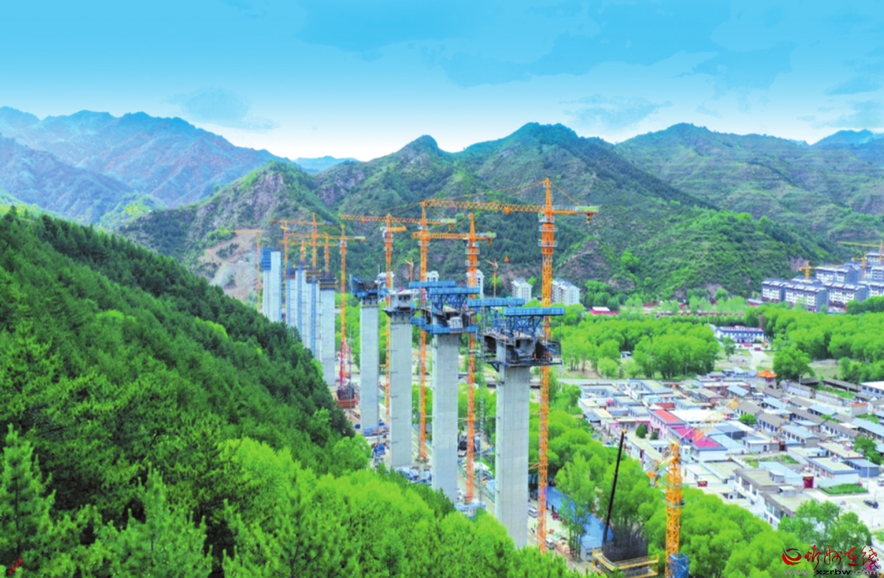 在雄忻高鐵五臺山段項目施工現(xiàn)場,青山環(huán)抱中,機械轟鳴,工程車輛穿梭。