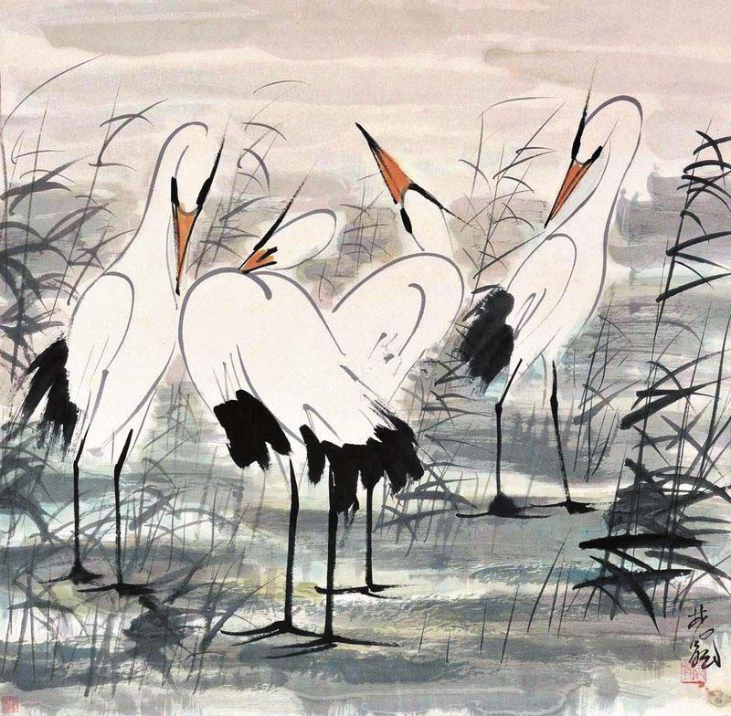 到了近現(xiàn)代,傳統(tǒng)文藝思想開始發(fā)生轉(zhuǎn)變,呂澂、康有為等人在繪畫領(lǐng)域提出改良思想,鶴主題的繪畫也有所變化。在林風眠創(chuàng)作的《群鶴圖》《雙鶴圖》《白鶴》等作品中,既可以看到中國畫白描的影子,又可以感受到西方速寫技法的影響。《群鶴圖》由幾只立于廣袤水草的白鶴構(gòu)成,它們姿態(tài)各不相同。與鶴之閑適姿態(tài)相對應(yīng)的是隨風浮動的蘆葦,它們在微風吹拂下雖形態(tài)萬千,但并不雜亂,在總體偏暗的色調(diào)中顯出和諧之味。《雙鶴圖》表現(xiàn)了鶴的輕盈姿態(tài),兩只鶴步伐保持一致,展示出閑適自得之感。林風眠筆下的鶴,顯然沒有古代繪畫中仙風道骨、富貴長壽之意,與寫意之鶴相比,其作品里的鶴與自然萬物融為一體,表達出強有力的現(xiàn)代語言。