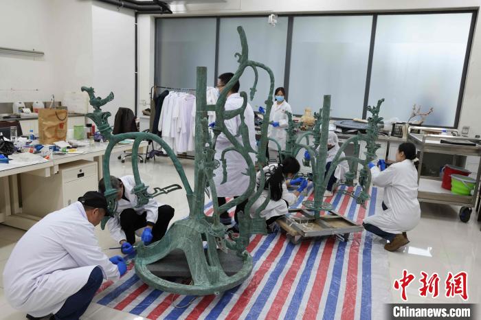 青銅神樹(shù)復(fù)制品制作現(xiàn)場(chǎng)。三星堆博物館供圖