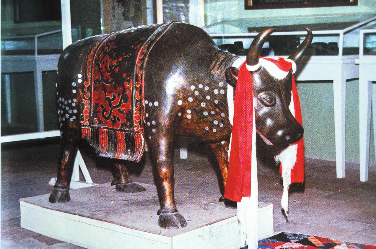 五臺山保存著一尊工藝精細、形態(tài)逼真、傳神入化的明代銅牛。這尊堪稱鑄造藝術品中佳品的銅牛,收藏在顯通寺藏珍樓內(nèi),通高85厘米,長146厘米。它體魄雄偉,頭向前伸,分足而立,兩角內(nèi)收,閉嘴蓄力,圓目正視,奮力前行。銅牛四足協(xié)調,造型逼真。銅牛的腰部有披墊,披墊上面繪有各種彩色花紋。銅牛原來還拉著一輛精致的銅車。車棚、輪、軸及車上的繩索均為銅質。文物部門鑒定其為國家一級文物。