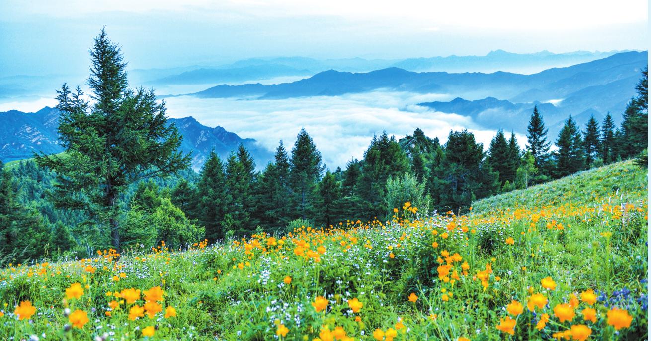 駝梁地形四周封閉,中為谷地,形成了山巒綿亙、溝壑縱橫、河川橫跨東西的自然生態(tài)景觀。其主峰海拔2281米,為“晉冀兩省四縣”交匯處,駝峰山巒蜿蜒,此起彼伏,猶如“靜臥巨駝”而取名駝梁。與五臺山風景名勝區(qū)東北相望,遙相呼應,有其獨特和不可替代之優(yōu)勢,同為五臺山旅游資源亮點。由山谷到山頂分布著落葉林混交林帶、樺樹林帶、落葉松林帶,生物垂直分布變化明顯。駝梁頂部,有一片亞高山草甸,約近萬畝的茵茵綠草,像碩大無比的地毯,與天際交接,一望無垠。隱于藍天白云和松林綠波之間,散落著漫山遍野的杜鵑花、金蓮花、百合花、燈籠花等,置身其間,如進花海,恍若仙境。因位于云霧縹緲的高山之巔,故被人譽為“云頂花海”。