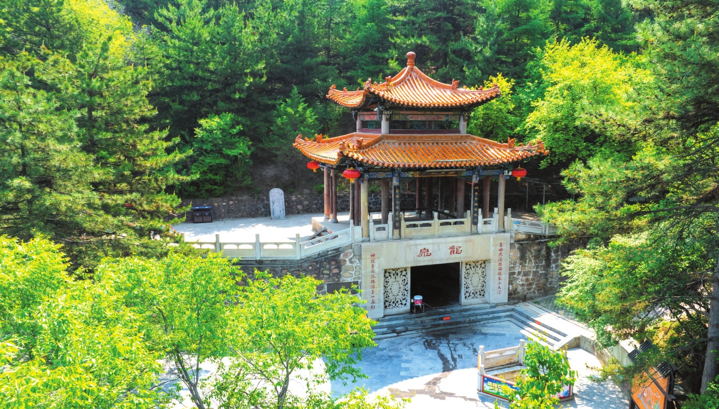 山有水而媚,土得水而沃。從大雄寶殿出來(lái),沿著西門旁一條小道不遠(yuǎn)處,就是那片號(hào)稱“天柱松濤”的松林了。只見(jiàn)樹(shù)干筆直,枝條蒼勁,直指云霄,林間松脂飄香,氣息悠然。人還在松林中流連尋芳,遠(yuǎn)遠(yuǎn)就能聽(tīng)到聞名已久的“天柱龍泉”在流淌。龍泉位于景區(qū)廟群西南的龍泉閣,作為“靜樂(lè)舊八景”之首的“天柱龍泉”,又名“犬舐泉”,《魏書(shū)》載:“爾朱榮高祖羽健居北秀容川。會(huì)有狗舐地,因而穿之,得甘泉,故名?!毕鄠魅谐錾颀?,故名龍泉。高山出泉是為奇觀,泉水清澈見(jiàn)底,旱不涸、澇不盈,夏飲清神,冬飲沁心。有“天柱圣境啟心智,龍泉奇觀令神怡”之頌。此泉水富含多種礦物質(zhì)和微量元素,是地地道道的“天然級(jí)礦泉水”。近幾年上山鍛煉的居民很多,人們上山時(shí)自帶裝水工具,攜泉水以做飯和飲用,期盼著龍泉水能給人帶來(lái)健康和好運(yùn)。站在龍泉邊,總能感受到一陣陣濕潤(rùn)的水氣撲面而來(lái),甚至像風(fēng)一樣輕繞著周身,使人置身于自然美景中不愿離開(kāi),連呼吸也變得無(wú)比暢快起來(lái)。