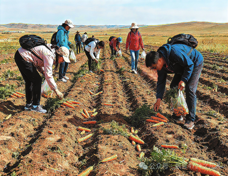 “撿秋”游演繹著“鄉(xiāng)土中國”的現(xiàn)代篇章。費(fèi)孝通在《鄉(xiāng)土中國》開篇即言“從基層上看去,中國社會是鄉(xiāng)土性的”。這種“鄉(xiāng)土性”的核心是人與土地的深度綁定。農(nóng)民靠土地生存,土地是文化認(rèn)同的根基?!皳烨铩边@種農(nóng)耕活動,如今以更加鮮活方式延續(xù)下來。對農(nóng)民而言,土地不僅是謀生手段,更是安身立命的“精神原鄉(xiāng)”。而城市游客的參與則賦予了“撿秋”新的意義。在城市里待久了,就想蹲在田里感受泥土的溫度,游客“撿秋”體驗(yàn)的是“春種秋收”踏實(shí)感。這種體驗(yàn)式參與是現(xiàn)代人對鄉(xiāng)土文明的“情感反哺”。游客們彎腰的身影既是對土地的致敬,也是對“根”的追尋。他們未必真懂農(nóng)事,但通過參與“撿秋”完成了對鄉(xiāng)土文化的認(rèn)同,被撿起的“果實(shí)”從“生存作物”演變?yōu)椤拔幕浇椤?。?dāng)前,內(nèi)蒙古各地推出的挖土豆、烤土豆等旅游項(xiàng)目是對鄉(xiāng)土資源的文化再“編碼”,當(dāng)土豆從田間走向游客的后備箱,“鄉(xiāng)土中國”便獲得了更加豐富的表達(dá)。
