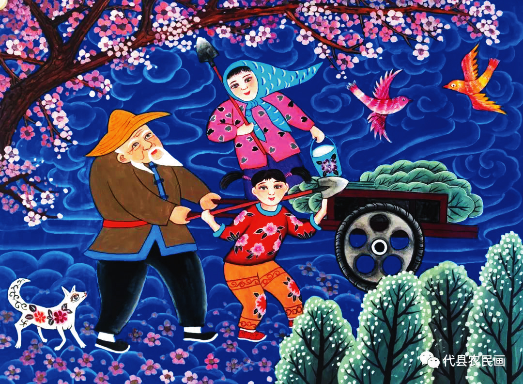 這些雁門巾幗,或是地道的農(nóng)民,或是行政事業(yè)單位、企業(yè)的工作者,或是退休下來的工薪人員,她們深深植根于代縣這方沃土,懷揣著對藝術(shù)的孜孜追求,不計(jì)名利,克服個(gè)人和家庭的重重困難,利用所有的空閑時(shí)間全身心投入到農(nóng)民畫的創(chuàng)作之中。