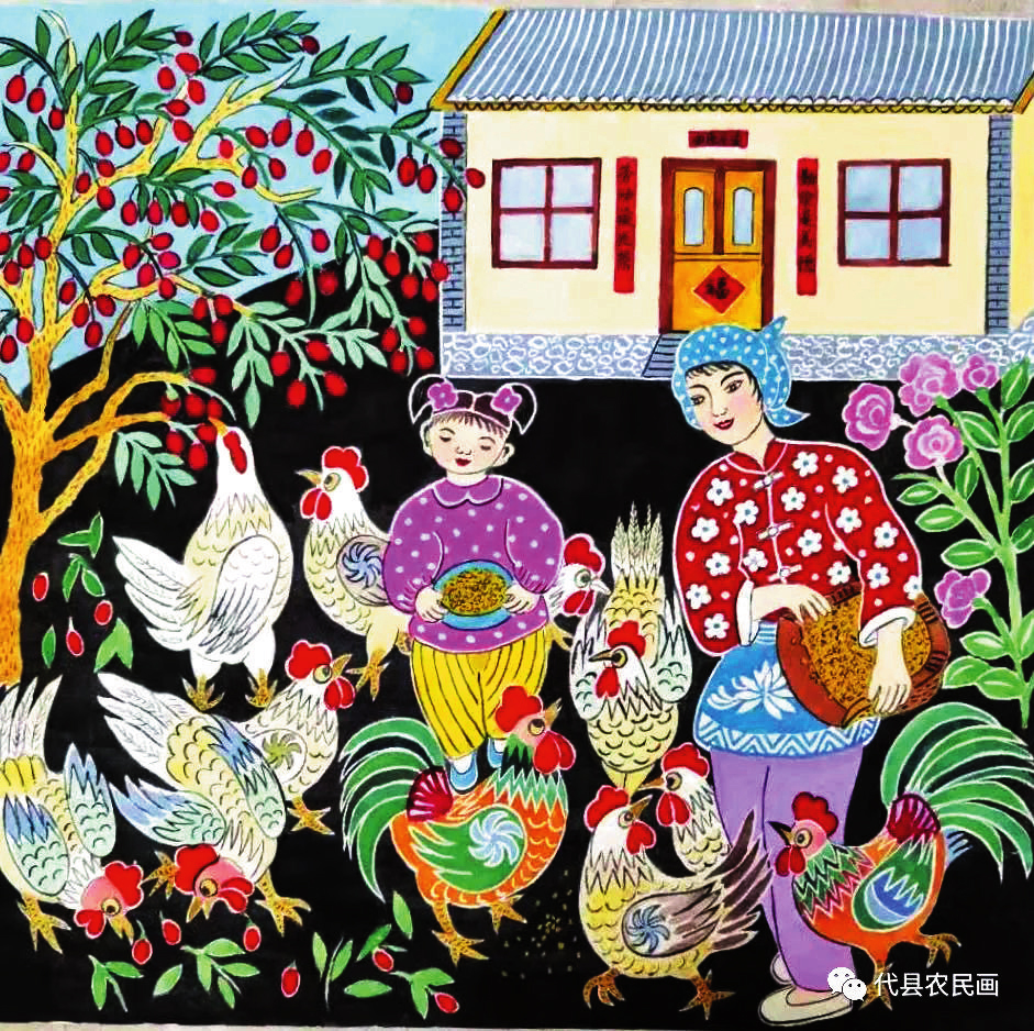 中國歷史文化名城代縣,文化底蘊(yùn)深厚,民俗傳統(tǒng)技藝精巧別致,1988年和2008年先后被文化部授予“中國民間繪畫畫鄉(xiāng)”“中國民間文化藝術(shù)之鄉(xiāng)”。該縣的農(nóng)民畫早在上世紀(jì)80年代初就在全國產(chǎn)生過較大影響,之后經(jīng)歷了一段低迷期。近年來在代縣農(nóng)民畫促進(jìn)會的推動之下,農(nóng)民畫又重新煥發(fā)出耀眼的光彩。先后涌現(xiàn)出多位畫家,其中尤以丁全愛、戴翠平、祁磊、賈永花、郎冬梅等18位女畫家組陣的雁門巾幗,在多年鉆研繪畫技巧的基礎(chǔ)上,創(chuàng)作出一幅幅特色鮮明、獨(dú)具匠心的畫作,成為閃耀三晉大地的矩陣,為傳承、弘揚(yáng)雁門文化做出了新貢獻(xiàn)。