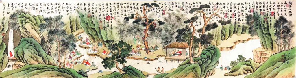 東晉永和九年(353年)上巳節(jié),會稽內(nèi)史王羲之和謝安、孫綽等人在山陰蘭亭修禊,曲水流觴,飲酒賦詩,所作詩歌后來結(jié)集為《蘭亭集》,王羲之為之撰序,即被稱作“天下第一行書”的《蘭亭序》,而蘭亭雅集的詩酒風流也成為千古佳話。在后世仿效的各類蘭亭雅集中,詩歌、繪畫、書法等多種藝術(shù)元素爭奇斗艷,形成華麗精致、傳承千載的文化景觀。