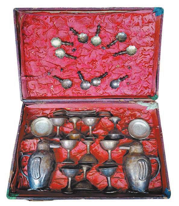 可惜該壺的用途一直未能確定,是酒壺、是茶壺,還是咖啡壺?現(xiàn)在入手了一套帶有包裝盒的整套器具(壺具2把,高腳杯、小圓盤、調(diào)羹和調(diào)羹架各10只),茅塞頓開,這應(yīng)該是咖啡壺套裝。從包漿和使用痕跡看,這套企鵝形銅質(zhì)鍍銀咖啡壺很可能是20世紀(jì)初生產(chǎn)的。