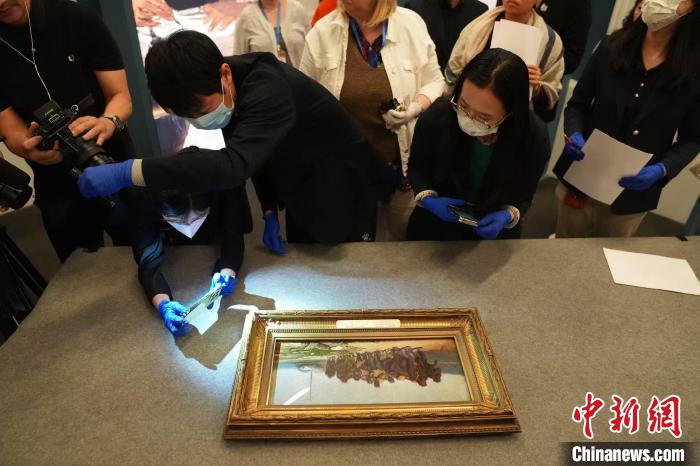 中俄兩國專家共同檢視剛開箱的《伏爾加河上的纖夫》油畫草圖。 史春陽 攝