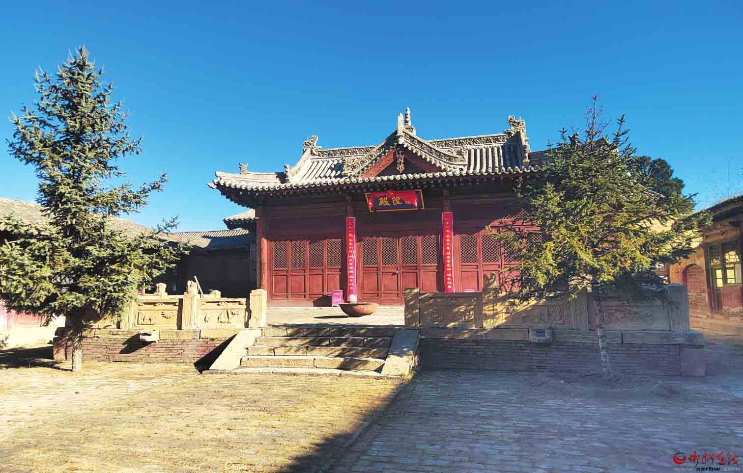 一進(jìn)院布局,中軸線現(xiàn)存有正殿1棟,兩側(cè)建有配殿,西北角建有偏殿。正殿磚砌臺(tái)基,面寬五間,進(jìn)深六椽,七檁前后廊式構(gòu)架,前檐斗拱為五踩,后檐為三踩斗拱,單檐懸山頂。前設(shè)月臺(tái),建有抱廈三間,單檐歇山頂。現(xiàn)新塑像3尊,正殿梁架有彩繪。