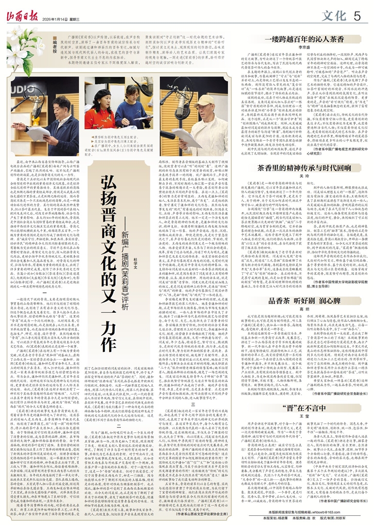 廣播劇《茉莉香》以聲傳情,以茶載道,在聲音構(gòu)筑的時(shí)空里,演繹了一曲百年晉商的誠(chéng)信傳承與時(shí)代新聲。該劇通過(guò)謙和祥茶莊的百年變遷,細(xì)膩勾連民國(guó)與現(xiàn)代兩代茶人的命運(yùn),在技藝的堅(jiān)守與革新中,探尋晉商文化生生不息的內(nèi)在脈動(dòng)。