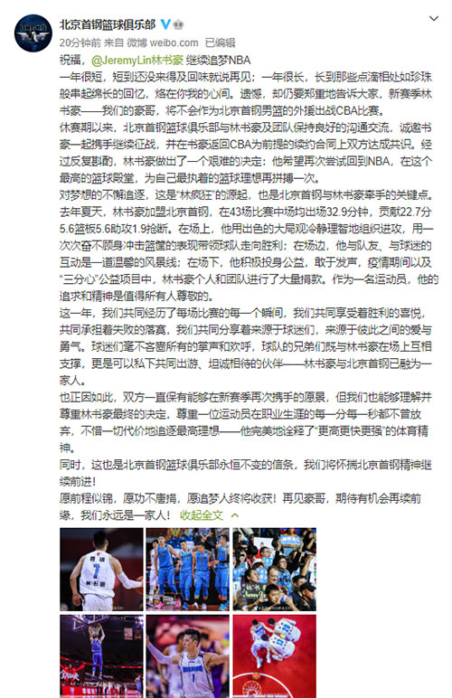 人民網(wǎng)北京9月15日電(楊喬棟)15日,林書豪通過個人社交平臺發(fā)布自制視頻宣布,下個賽季將不再代表北京首鋼男籃征戰(zhàn)CBA賽場,而將繼續(xù)尋求征戰(zhàn)美國職業(yè)籃球聯(lián)賽的機會。林書豪在視頻中稱,最近四周都在思考下一步的規(guī)劃,但是最終還是忍痛做了一個艱難的決定——暫時告別CBA,“我決定今年(下個賽季)不回首鋼去打球,這個決定是我人生最難的一個決定。”隨后,北京首鋼男籃通過官方微博發(fā)布長文,在確認林書豪“離開”的同時也第一時間為其送上祝福。北京男籃官宣全文如下: