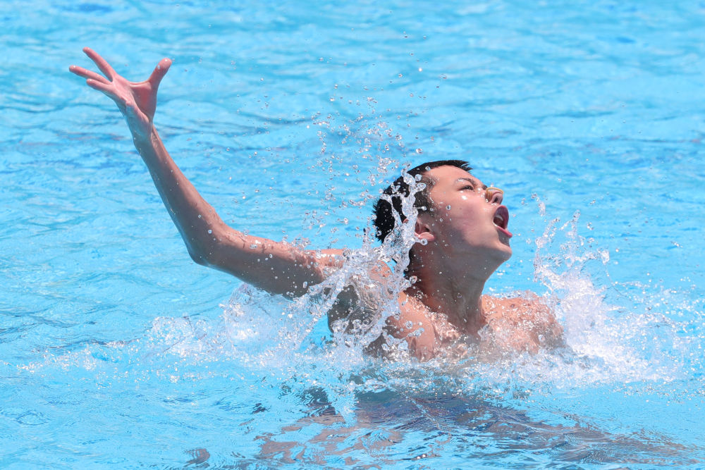 5月14日,楊順誠在比賽中。當(dāng)日,在埃及霍爾格達(dá)舉行的世界泳聯(lián)花樣游泳世界杯埃及站男子單人自由自選決賽中,中國選手楊順誠以291.9209分的成績獲得冠軍。新華社發(fā)(艾哈邁德·戈馬攝)