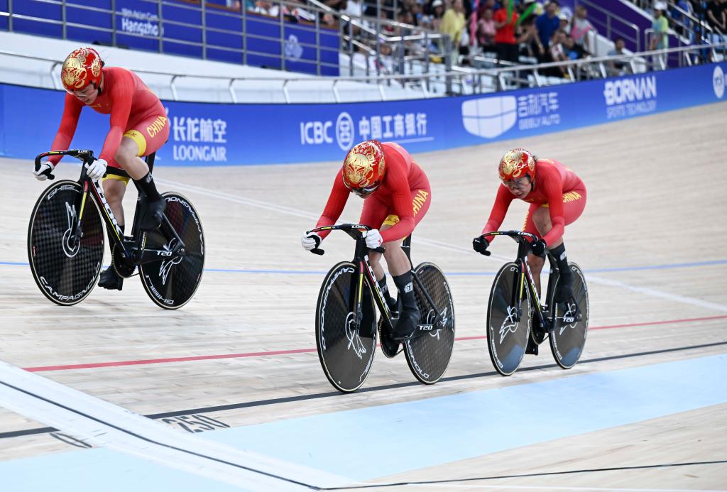 26日傍晚舉行的女子團體競速賽決賽中,一道紅色閃電劃破位于千島湖畔的自行車館,激起場內(nèi)一陣陣助威聲。鮑珊菊和隊友從一開始就占據(jù)領(lǐng)先位置,并最終以46秒376創(chuàng)造新的亞運會紀(jì)錄,將金牌收入囊中。