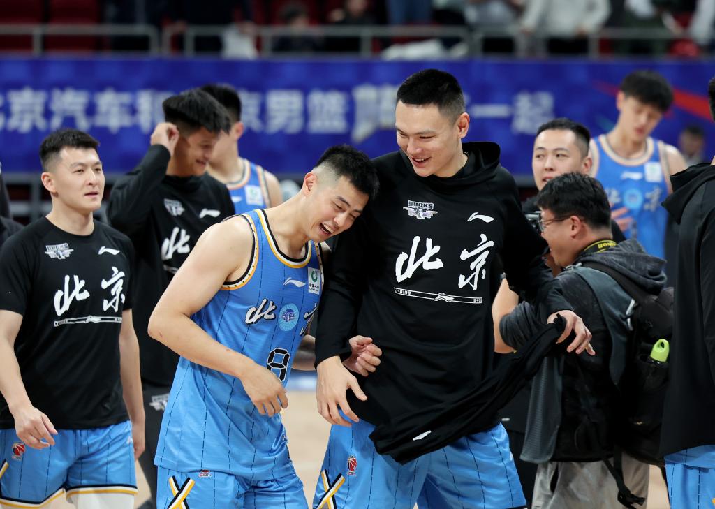 11月8日,北京隊(duì)球員朱彥西(前右)賽后與隊(duì)友方碩(前左)慶祝勝利。新華社記者 張晨 攝