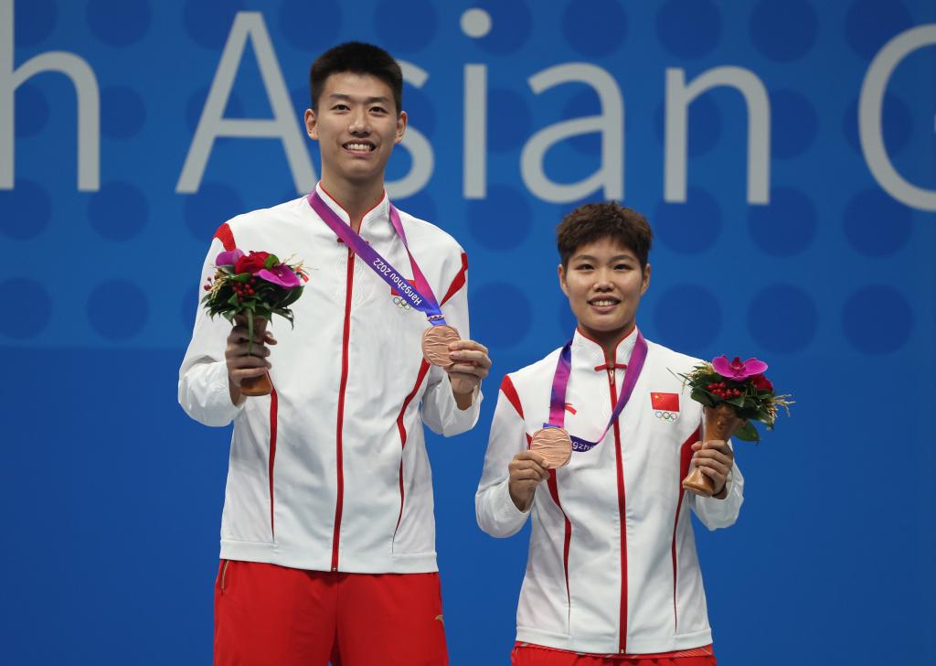 10月7日,杭州亞運(yùn)會(huì)羽毛球混雙季軍馮彥哲/黃東萍(右)在頒獎(jiǎng)儀式上。新華社記者 陳斌 攝