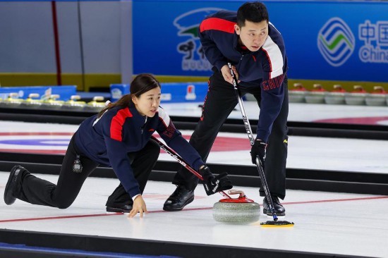 20日,在第十四屆全國冬季運(yùn)動(dòng)會(huì)冰壺(公開組)混雙決賽中,黑龍江隊(duì)以7:6險(xiǎn)勝福建隊(duì),奪得金牌。