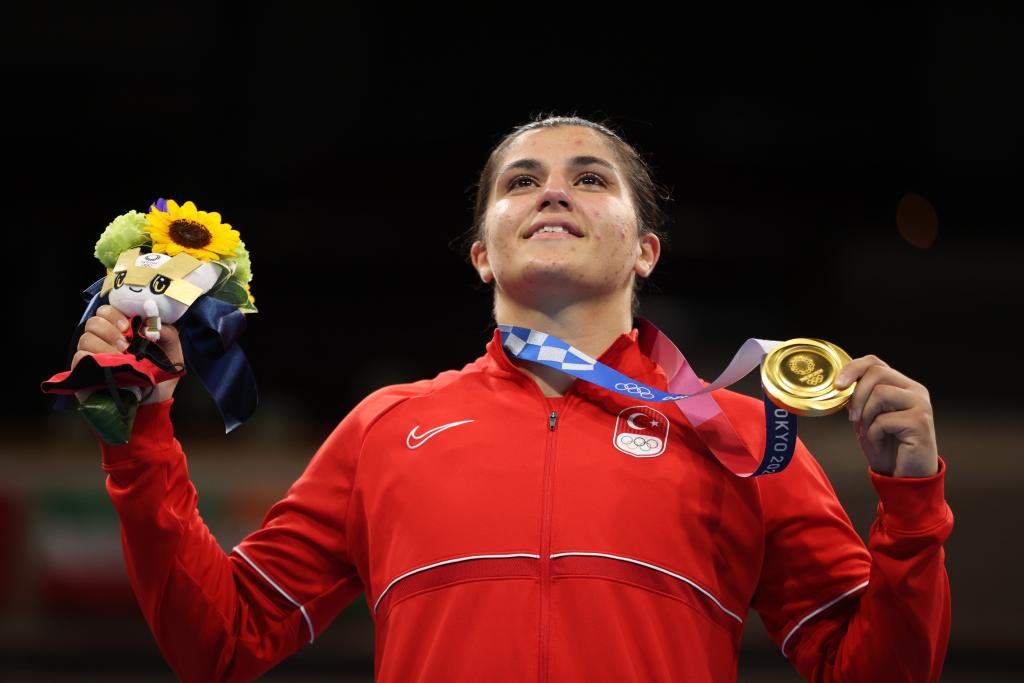 2021年8月7日,獲得冠軍的土耳其選手蘇梅內(nèi)利在領(lǐng)獎臺上。當(dāng)日,東京奧運(yùn)會拳擊女子69公斤級頒獎儀式舉行。新華社記者 歐東衢 攝