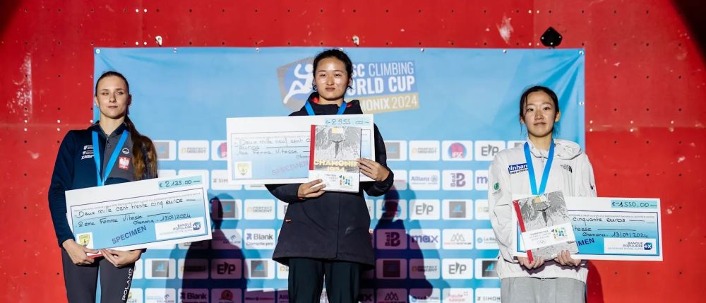中國(guó)選手張少琴(中)在2024攀巖世界杯法國(guó)夏蒙尼站中獲得女子速度項(xiàng)目冠軍。圖源:國(guó)際攀聯(lián)官網(wǎng)