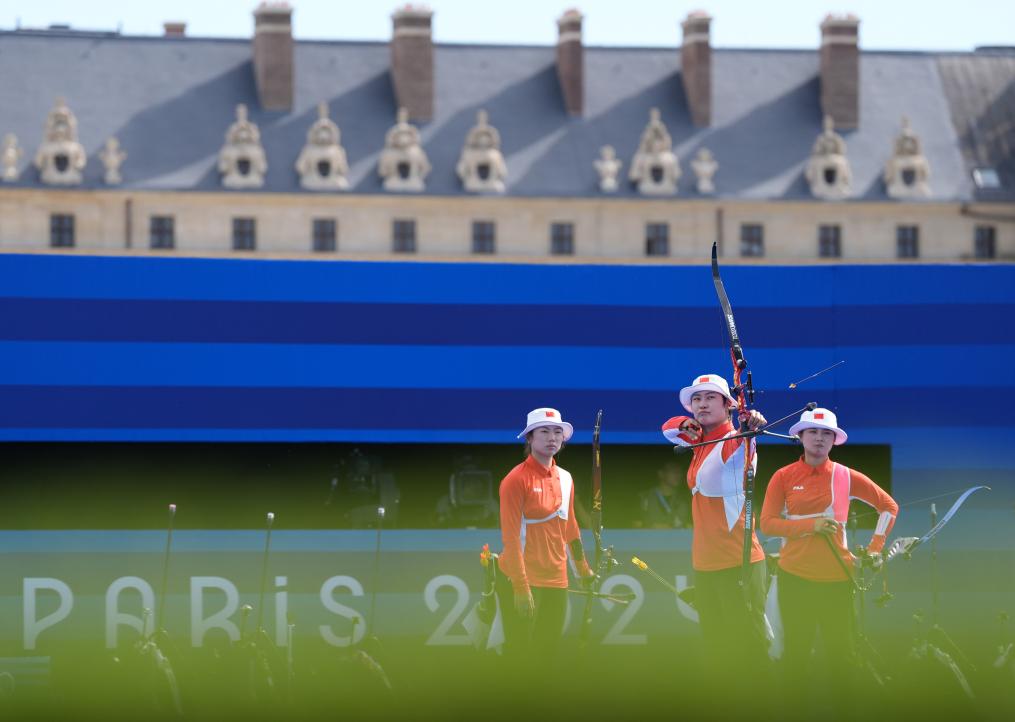 巴黎奧運(yùn)會(huì)射箭女子團(tuán)體比賽28日在榮軍院進(jìn)行。中國隊(duì)在四分之一決賽、半決賽中分別戰(zhàn)勝印度尼西亞隊(duì)和墨西哥隊(duì),與先后戰(zhàn)勝中國臺(tái)北、荷蘭隊(duì)的韓國隊(duì)會(huì)師決賽。