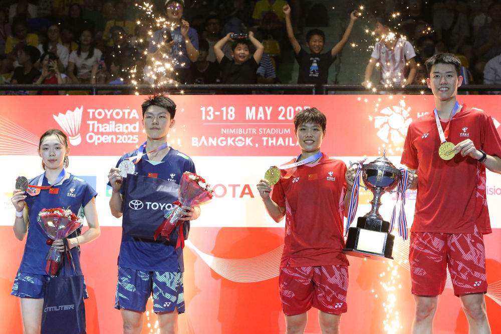 5月18日,冠軍馮彥哲(右一)/黃東萍(右二)和亞軍高家炫(左二)/吳夢瑩在頒獎儀式上。新華社發(fā)(拉亨 攝)